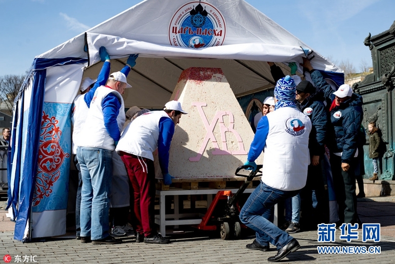 當?shù)貢r間2018年4月8日,俄羅斯莫斯科,為慶祝東正教復活節(jié),莫斯科救世主大教堂前現(xiàn)一個1141公斤的傳統(tǒng)復活節(jié)蛋糕,打破吉尼斯世界紀錄。(圖片來源:東方IC)