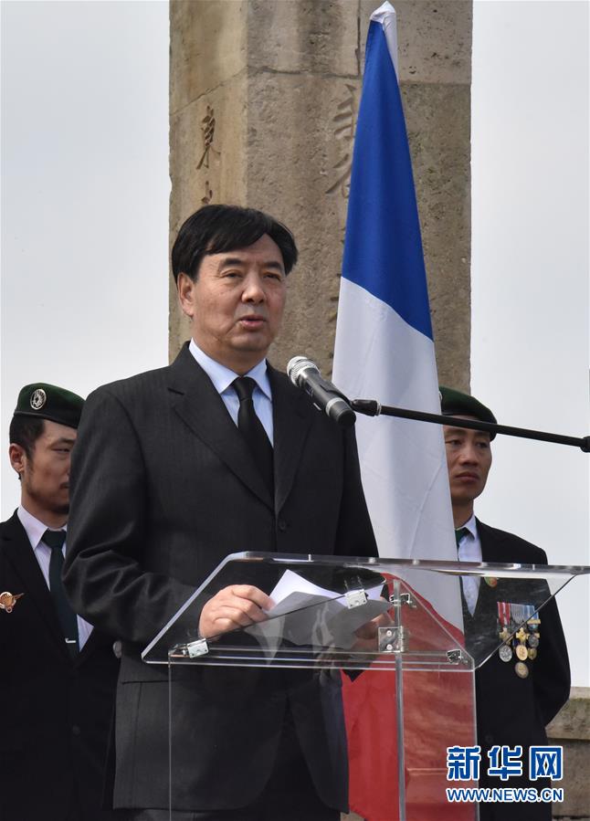 4月8日,在法國諾萊特華工墓園,中國駐法大使翟雋在祭奠儀式上發(fā)言。新華社記者吳濤 攝