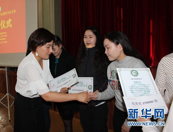 5月11日,蒙古國(guó)第六屆大中學(xué)生漢字硬筆書法比賽頒獎(jiǎng)儀式現(xiàn)場(chǎng)。新華網(wǎng)發(fā) 意特格樂(lè)攝