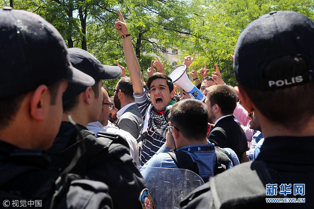 5月15日,土耳其安卡拉,示威者在以色列領(lǐng)事館附近投擲雞蛋和石塊,抗議美國(guó)駐以色列使館遷至耶路撒冷。(圖片來(lái)源:視覺(jué)中國(guó))