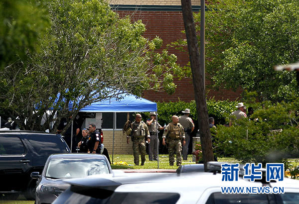 5月18日,在美國得克薩斯州加爾維斯頓郡圣菲市,安全人員在發(fā)生槍擊的圣菲高中周圍警戒。新華社發(fā)(宋穹 攝)