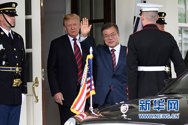 5月22日,美國總統(tǒng)特朗普(左二)在華盛頓白宮歡迎到訪的韓國總統(tǒng)文在寅(左三)。 新華社記者楊承霖攝