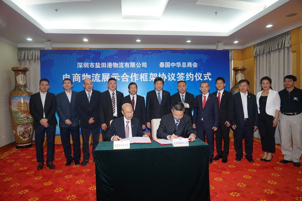 泰國(guó)中華總商會(huì)主席陳振治一行與深圳市鹽田港物流有限公司簽署電商物流展示合作框架協(xié)議。圖中前排為陳振治(左)和劉南安(右)。主辦方供圖。