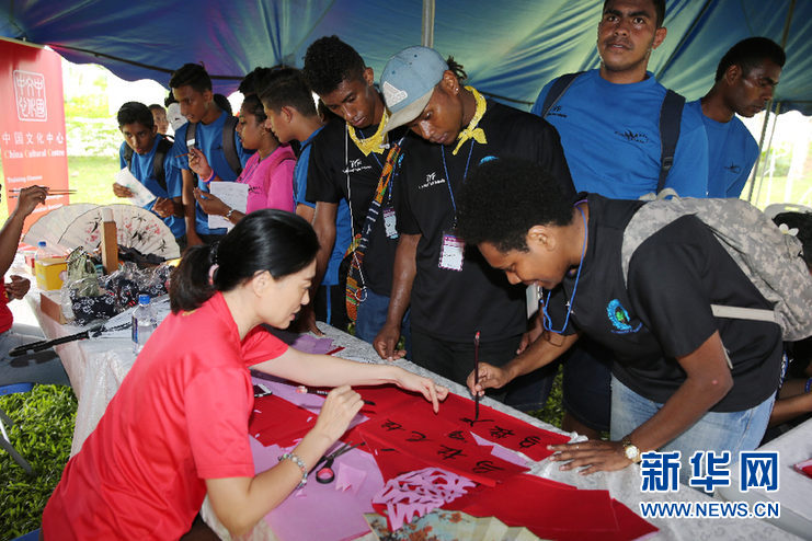 斐濟青年正在中國文化中心老師的指導(dǎo)下用毛筆寫自己的姓名。 新華網(wǎng)記者張永興 攝