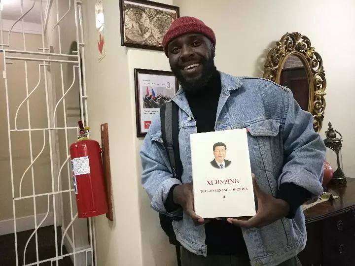 2018年7月20日,南非約翰內(nèi)斯堡大學(xué)孔子學(xué)院,學(xué)院職員邦加恩向記者展示剛從圖書室借到的《習(xí)近平談治國(guó)理政》(第二卷)英文版。(新華社記者劉衛(wèi)兵攝)