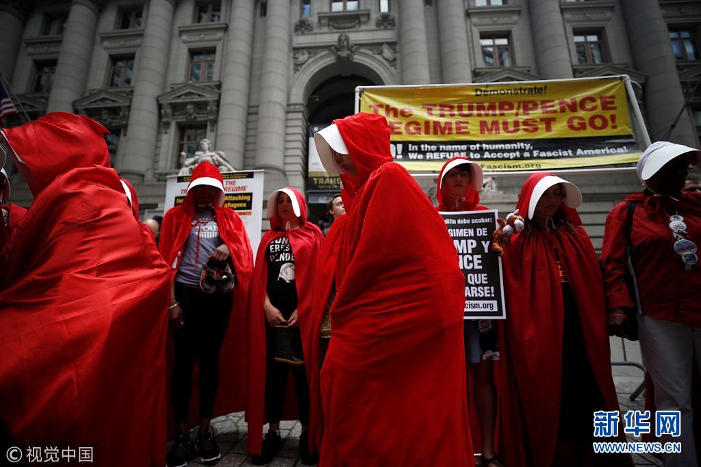 當?shù)貢r間2018年7月31日,美國紐約,女性示威者扮成美劇《使女的故事》中的“使女”在亞歷山大·漢密爾頓海關(guān)大樓前示威,抗議美國總統(tǒng)特朗普和副總統(tǒng)麥克·彭斯。她們手持鞋子,代表被迫與父母分離的移民兒童。(圖片來源:視覺中國)