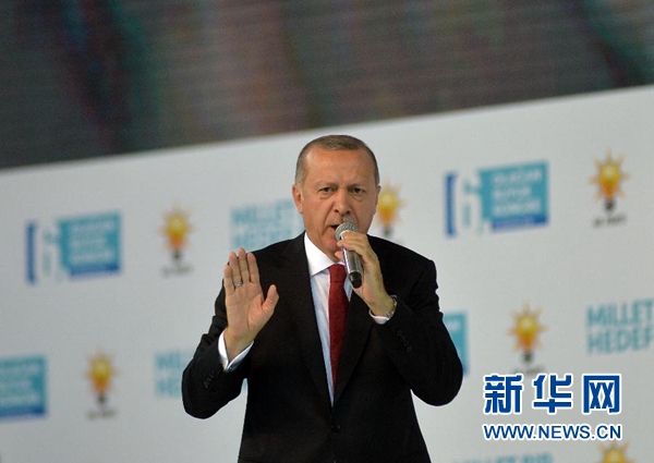 8月18日,在土耳其首都安卡拉,土耳其總統(tǒng)埃爾多安在執(zhí)政黨正義與發(fā)展黨年度大會上發(fā)表演講。 土耳其總統(tǒng)埃爾多安18日表示,土耳其不會向經(jīng)濟威脅屈服。 新華社發(fā)(穆斯塔法·卡亞攝)