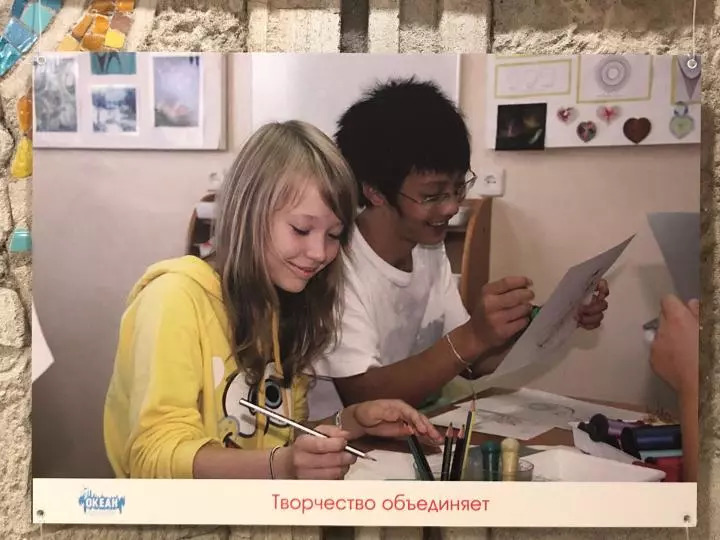 “海洋”全俄兒童中心展示的中國(guó)孩子和俄羅斯孩子一起上課的照片(新華社記者孟娜攝)