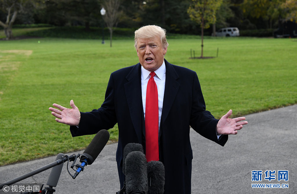 當(dāng)?shù)貢r(shí)間2018年10月31日,美國(guó)華盛頓,美國(guó)總統(tǒng)特朗普啟程前往佛羅里達(dá)州出席競(jìng)選集會(huì),在白宮南草坪發(fā)表講話。特朗普稱,計(jì)劃部署在美墨邊境的現(xiàn)役軍人數(shù)量或增加至15000人,以嚴(yán)防來勢(shì)洶洶的“大篷車”移民。(圖片來源:視覺中國(guó))