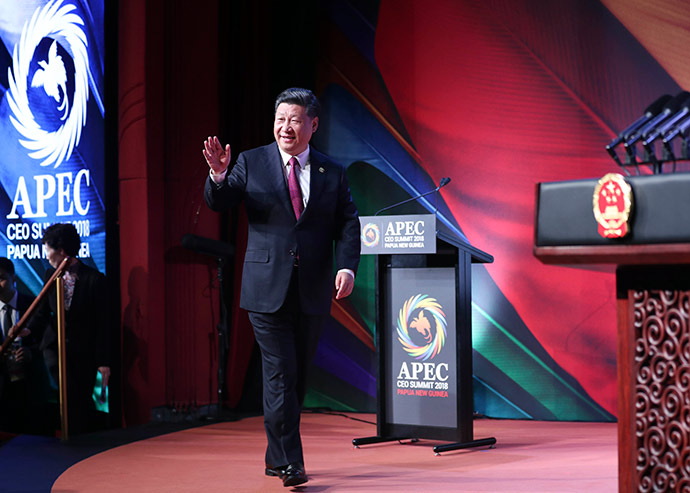 11月17日,國(guó)家主席習(xí)近平應(yīng)邀出席在巴布亞新幾內(nèi)亞莫爾茲比港舉行的亞太經(jīng)合組織工商領(lǐng)導(dǎo)人峰會(huì)并發(fā)表題為《同舟共濟(jì)創(chuàng)造美好未來(lái)》的主旨演講。這是習(xí)近平步入會(huì)場(chǎng)。新華社記者 黃敬文 攝