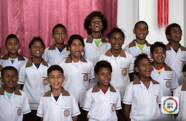 2018年11月13日,巴布亞新幾內(nèi)亞首都莫爾茲比港。孩子們?yōu)闅g迎出席中國(guó)-巴新友誼學(xué)?!げ紙D卡學(xué)園啟用儀式的習(xí)近平主席精心排練歌曲《茉莉花》。(新華社記者費(fèi)茂華攝)