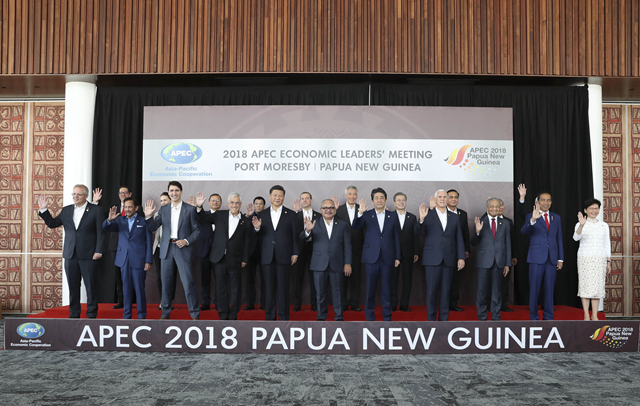 2018年11月18日,亞太經(jīng)合組織第二十六次領(lǐng)導(dǎo)人非正式會(huì)議在巴布亞新幾內(nèi)亞莫爾茲比港舉行。國(guó)家主席習(xí)近平出席并發(fā)表題為《把握時(shí)代機(jī)遇 共謀亞太繁榮》的重要講話。會(huì)議開始前,習(xí)近平同其他亞太經(jīng)合組織經(jīng)濟(jì)體領(lǐng)導(dǎo)人、代表合影。(新華社記者丁林?jǐn)z)