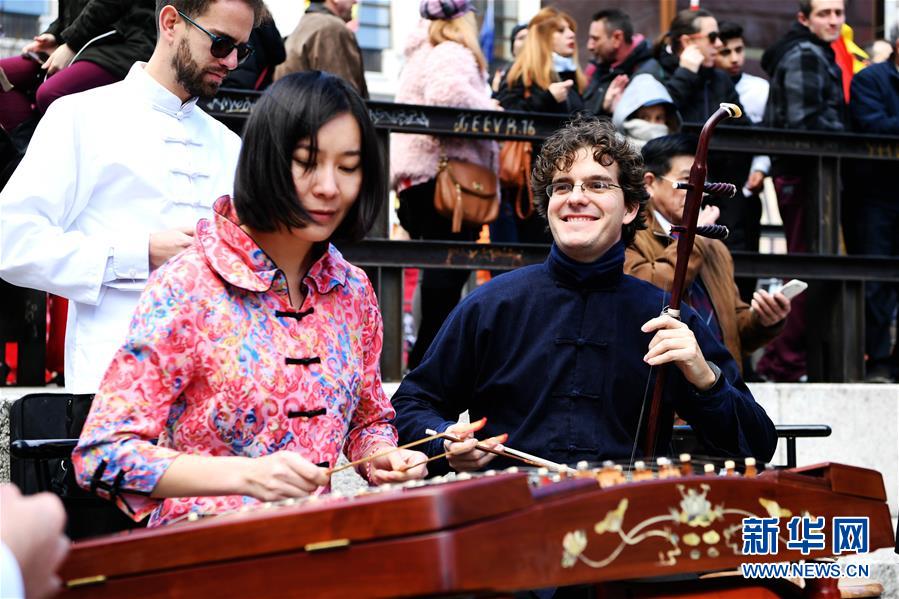 2018年2月11日,在西班牙馬德里,參加弘揚中國傳統(tǒng)文化的“快閃”藝術表演演員在索菲亞王后博物館前演奏民樂。新華社記者 郭求達 攝