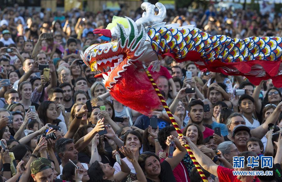2018年2月10日,在阿根廷布宜諾斯艾利斯舉行的中國春節(jié)廟會上,觀眾拍攝舞龍。新華社發(fā)(馬丁·薩巴拉 攝)