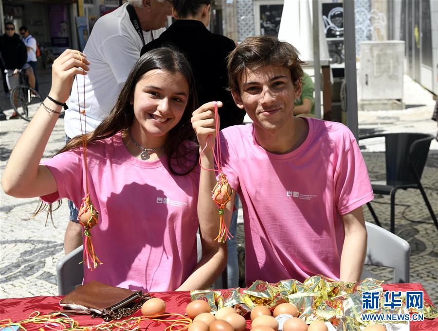 2018年6月16日,在葡萄牙阿威羅舉行的端午龍舟巡游活動開幕式上,阿威羅大學孔子學院的學生展示他們制作的蛋袋。新華社記者 張立云 攝