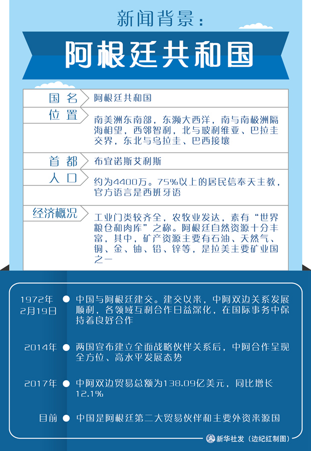 1972年2月19日,中國與阿根廷建交。建交以來,中阿雙邊關(guān)系發(fā)展順利,各領(lǐng)域互利合作日益深化,在國際事務(wù)中保持著良好合作。2014年兩國宣布建立全面戰(zhàn)略伙伴關(guān)系后,中阿合作呈現(xiàn)全方位、高水平發(fā)展態(tài)勢。目前,中國是阿根廷第二大貿(mào)易伙伴和主要外資來源國。2017年中阿雙邊貿(mào)易總額為138.09億美元,同比增長12.1%。