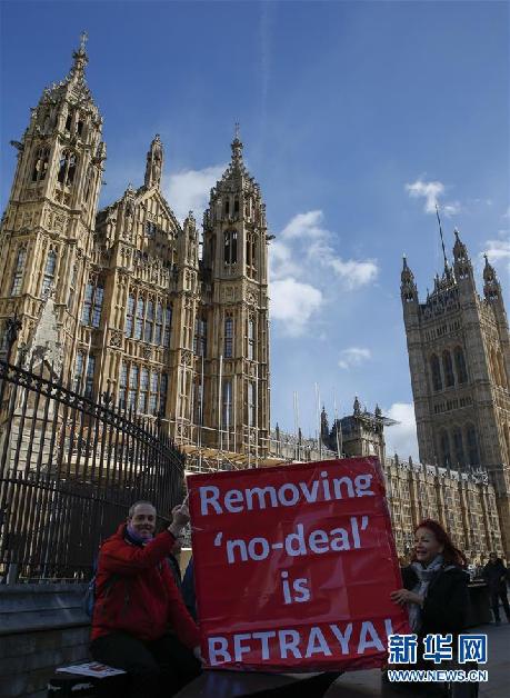3月14日,在英國倫敦,示威者手持標(biāo)語站在議會大廈外。新華社記者韓巖攝