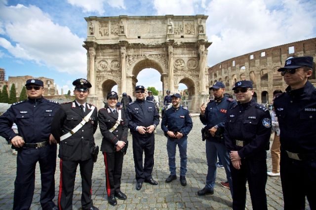 2016年5月2日,中意首次聯(lián)合警務(wù)巡邏在意大利羅馬啟動(dòng)。在意大利羅馬君士坦丁凱旋門外,中方警員與意方警員合影。新華社記者金宇攝