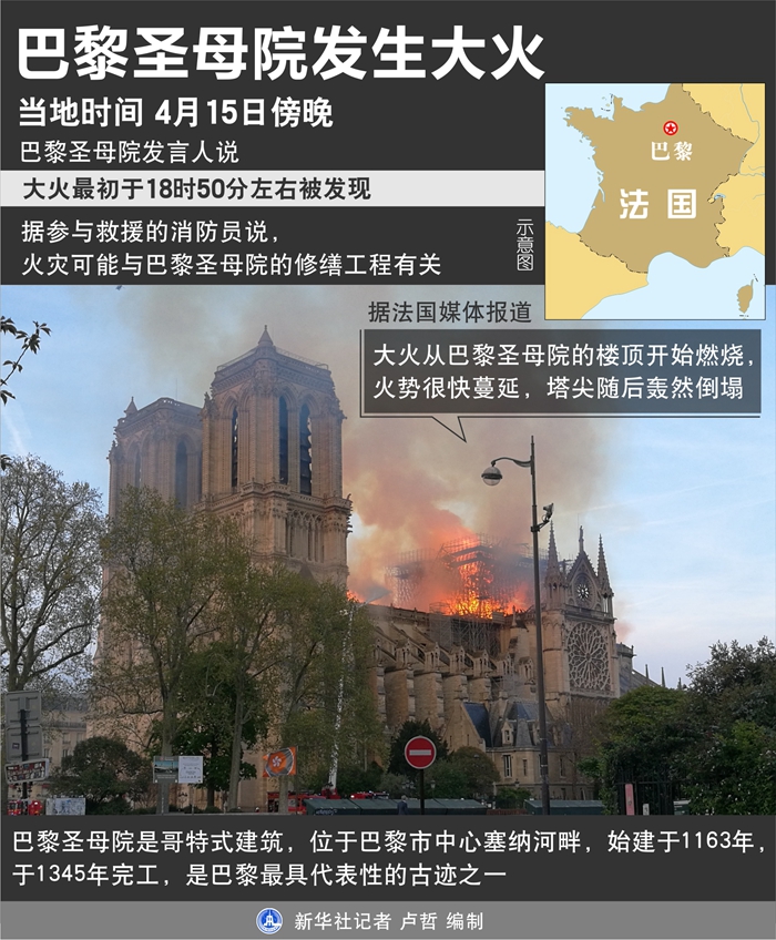 熊熊烈火之中,巴黎圣母院塔尖轟然倒塌。當(dāng)?shù)貢r間15日傍晚18時許,位于巴黎市中心、有著800多年歷史的巴黎圣母院發(fā)生大火,整座建筑損毀嚴(yán)重。