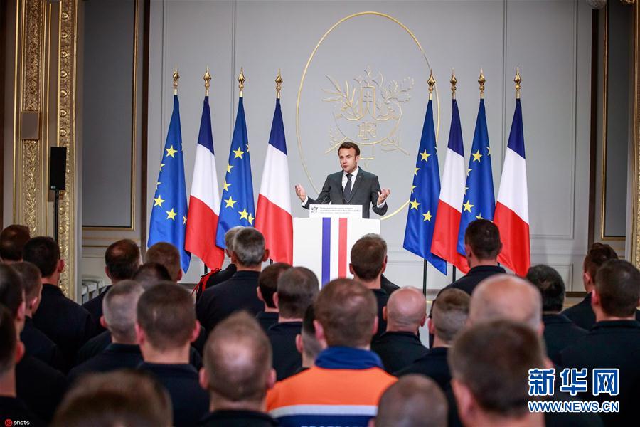 當?shù)貢r間2019年4月18日,法國巴黎,法國總統(tǒng)馬克龍在愛麗舍宮接見參與巴黎圣母院火災救援任務的消防員。(圖片來源:東方IC)
