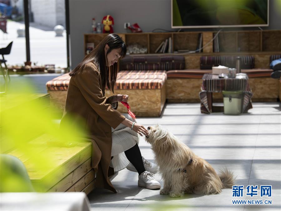 關(guān)嫻在拉薩自己開的客棧里與寵物互動(dòng)(4月10日攝)。新華社發(fā)(孫非 攝)