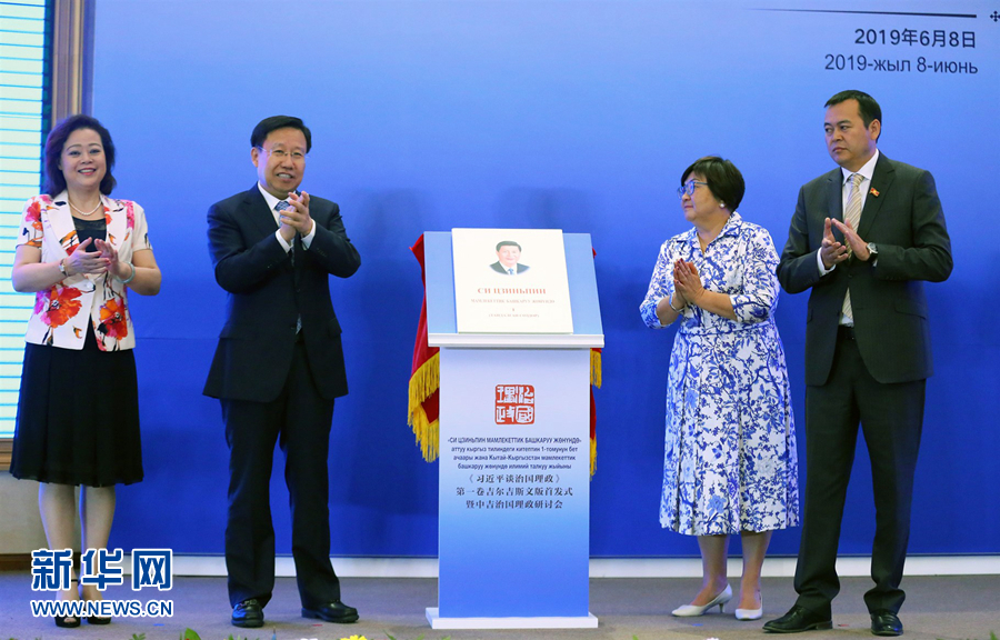 6月8日,在吉爾吉斯斯坦比什凱克,吉爾吉斯斯坦前總統(tǒng)奧通巴耶娃(右二)、吉爾吉斯斯坦議會副議長巴基羅夫(右一)、中宣部常務(wù)副部長王曉暉(左二)和中國駐吉爾吉斯斯坦大使杜德文(左一)共同為《習(xí)近平談治國理政》第一卷吉爾吉斯文版新書揭幕。 《習(xí)近平談治國理政》第一卷吉爾吉斯文版首發(fā)式暨中吉治國理政研討會6月8日在比什凱克總統(tǒng)官邸舉行。 新華社發(fā)(羅曼攝)