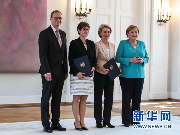 克蘭普-卡倫鮑爾當(dāng)天在德國(guó)總統(tǒng)府接受任命書。總理默克爾、馮德萊恩以及聯(lián)邦參議院第一副議長(zhǎng)米歇爾·穆勒出席任命儀式。