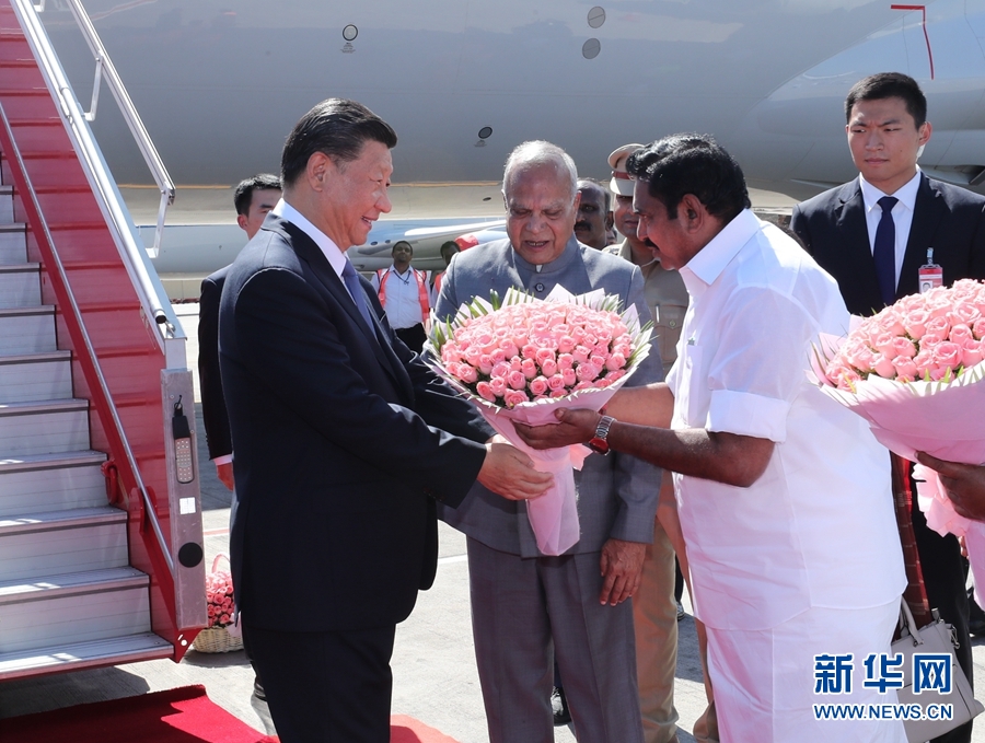 10月11日,國家主席習(xí)近平乘專機(jī)抵達(dá)金奈,應(yīng)印度共和國總理莫迪邀請,出席中印領(lǐng)導(dǎo)人第二次非正式會晤。印度泰米爾納德邦邦長普羅希特、首席部長帕拉尼斯瓦米等在舷梯旁迎接,向習(xí)近平敬獻(xiàn)鮮花。 新華社記者 鞠鵬 攝