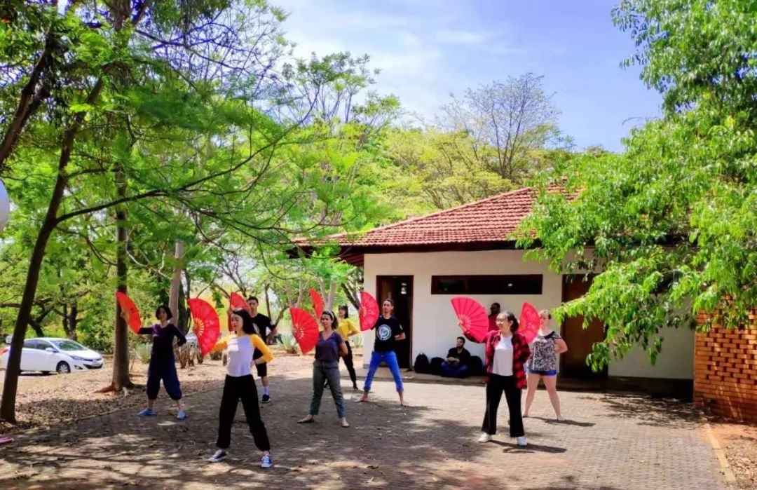 ▲巴西學(xué)生在巴西利亞大學(xué)孔子學(xué)院體驗中國扇子舞。(巴西利亞大學(xué)孔子學(xué)院供圖)
