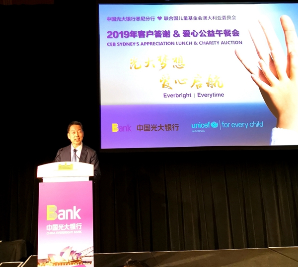 中國光大銀行悉尼分行行長于洪德在拍賣會開始前致辭說,光大銀行衷心感謝廣大客戶和合作伙伴對其業(yè)務(wù)發(fā)展的支持,希望通過慈善拍賣為澳大利亞兒童健康成長盡一份力、作更多貢獻。