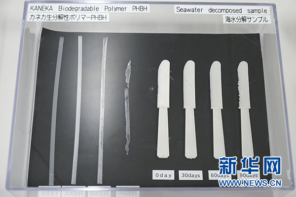 鐘化公司是日本一家知名化學(xué)品公司,記者日前前往鐘化公司的大阪總部,參觀了該公司研發(fā)的可降解聚合物“PHBH”。據(jù)介紹,這種可自然降解聚合物“PHBH”百分之百來(lái)源于植物,通過(guò)培養(yǎng)攝取植物油的微生物進(jìn)行生產(chǎn)提取,可用于制造各種塑料制品,“PHBH”在自然界中可被多種微生物分解。鐘化公司還實(shí)物展示了“PHBH”塑料制品在海水中自然降解的不同階段,例如一根吸管在海水中90天幾乎可被自然降解殆盡。