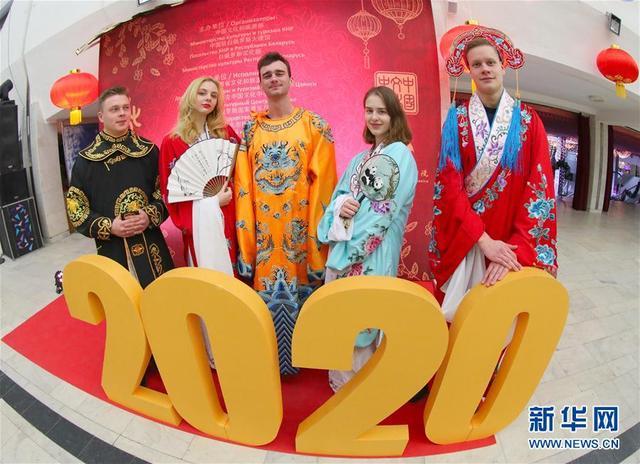 1月16日,在白俄羅斯首都明斯克,身著中國戲服的白俄羅斯人合影留念。 新華社發(fā)(任科夫攝)