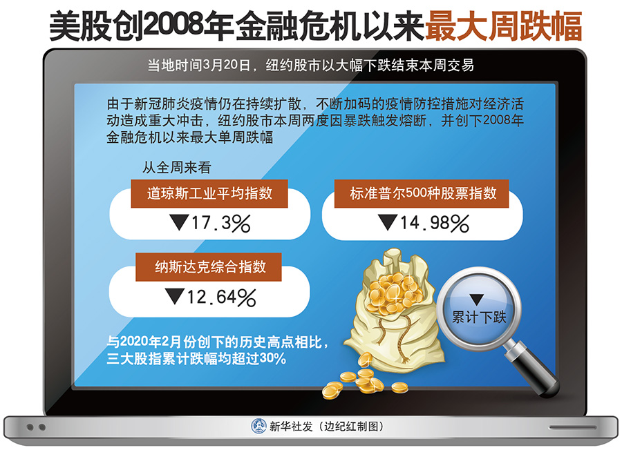 由于新冠肺炎疫情仍在持續(xù)擴(kuò)散,不斷加碼的疫情防控措施對經(jīng)濟(jì)活動造成重大沖擊,紐約股市本周兩度因暴跌觸發(fā)熔斷,并創(chuàng)下2008年金融危機(jī)以來最大單周跌幅。