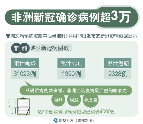 新華社達(dá)累斯薩拉姆4月26日電 綜合新華社駐非洲地區(qū)記者報(bào)道:非洲疾病預(yù)防控制中心26日發(fā)布的新冠疫情數(shù)據(jù)顯示,非洲地區(qū)新冠累計(jì)確診病例數(shù)為31023例,累計(jì)死亡1390例,累計(jì)治愈9328例。為支持非洲各國(guó)抗擊新冠疫情,聯(lián)合國(guó)推出信息平臺(tái)協(xié)助抗疫。