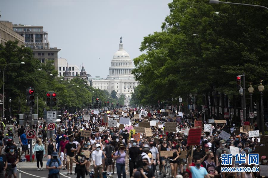 6月6日,人們?cè)诿绹?guó)華盛頓國(guó)會(huì)附近游行。美國(guó)首都迎來(lái)了十幾天來(lái)參與人數(shù)最多的游行活動(dòng)。新華社記者 劉杰 攝