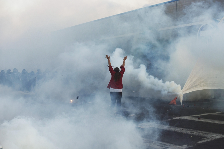 5月30日晚,在美國(guó)明尼蘇達(dá)州明尼阿波利斯市,抗議者在防暴警察施放的催淚瓦斯中與警察對(duì)峙。新華社發(fā)(安格斯·亞歷山大攝)