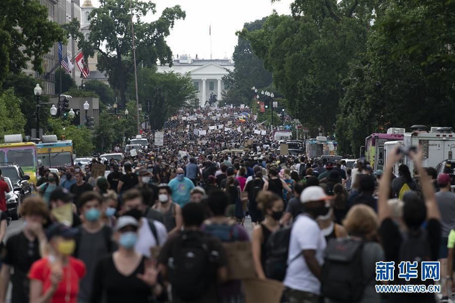 6月6日,人們?cè)诿绹?guó)華盛頓白宮附近游行。美國(guó)首都迎來(lái)了十幾天來(lái)參與人數(shù)最多的游行活動(dòng)。新華社記者 劉杰 攝