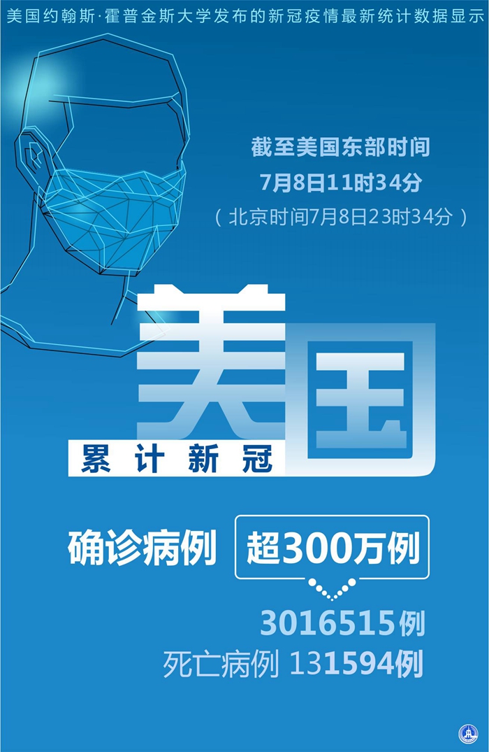 新華社紐約7月8日電 美國約翰斯·霍普金斯大學(xué)8日發(fā)布的新冠疫情最新統(tǒng)計(jì)數(shù)據(jù)顯示,美國累計(jì)確診病例超過300萬例。