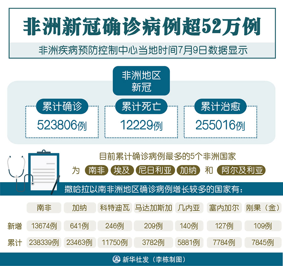 新華社雅溫得7月9日電 綜合新華社駐非洲地區(qū)記者報道:非洲疾病預防控制中心9日數(shù)據顯示,非洲地區(qū)新冠累計確診病例已達523806例,累計死亡12229例,累計治愈255016例。