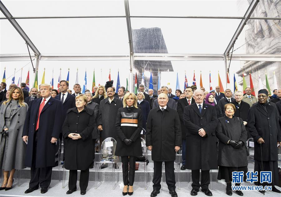 2018年11月11日,在法國巴黎,俄羅斯總統(tǒng)普京(前右四)、德國總理默克爾(前左三)與美國總統(tǒng)特朗普(前左二)出席紀念儀式。當日,法國政府在巴黎凱旋門前舉行儀式,隆重紀念第一次世界大戰(zhàn)結束一百周年。新華社記者 陳益宸 攝