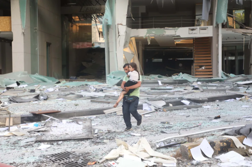 8月4日,在黎巴嫩首都貝魯特,一名男子抱著孩子走過嚴重受損的建筑。新華社發(fā)(比拉爾·賈維希攝)