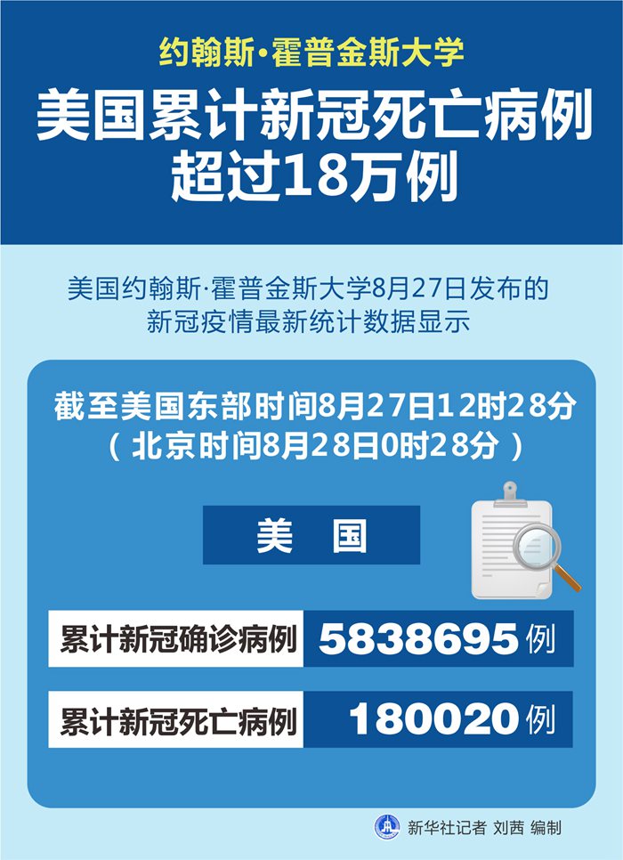 新華社紐約8月27日電? 美國約翰斯·霍普金斯大學27日發(fā)布的新冠疫情最新統(tǒng)計數(shù)據(jù)顯示,截至美國東部時間27日12時28分(北京時間28日0時28分),美國累計新冠死亡病例180020例,累計確診病例5838695例。