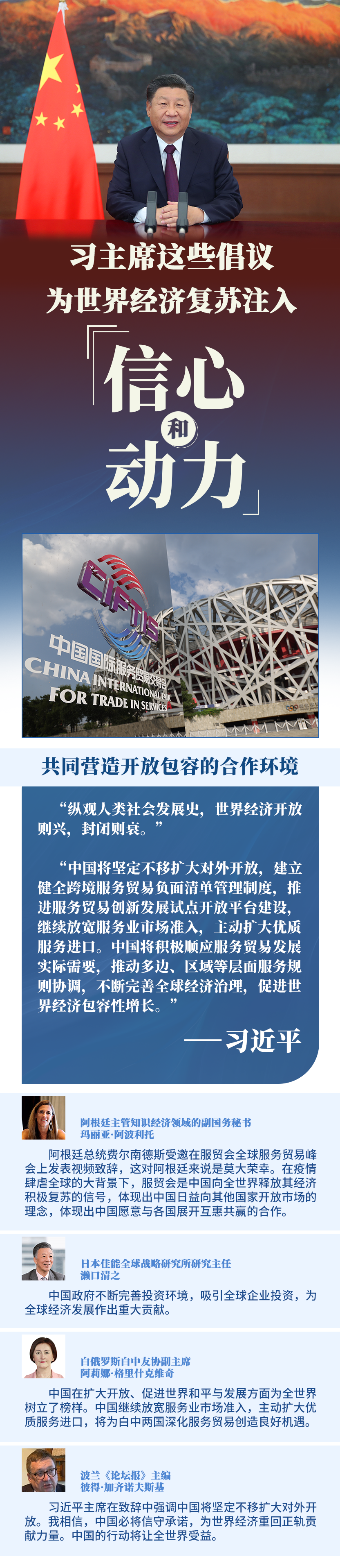 在全球范圍新冠疫情尚未得到全面控制、經(jīng)濟(jì)全球化遭遇逆流的背景下,習(xí)主席就促進(jìn)全球服務(wù)業(yè)開放合作提出3點(diǎn)倡議,為推動世界經(jīng)濟(jì)盡快復(fù)蘇注入信心和動力,向國際社會展現(xiàn)中國負(fù)責(zé)任大國的作為和擔(dān)當(dāng)。