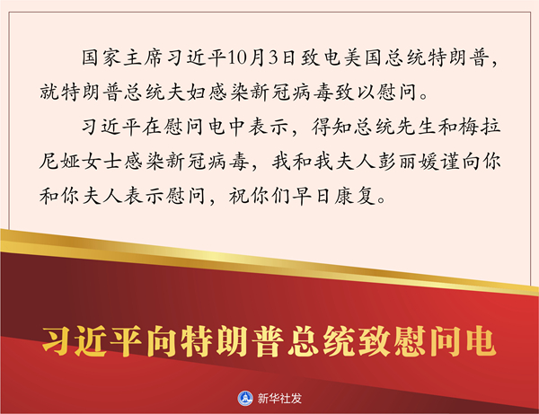 習(xí)近平在慰問電中表示,得知總統(tǒng)先生和梅拉尼婭女士感染新冠病毒,我和我夫人彭麗媛謹(jǐn)向你和你夫人表示慰問,祝你們早日康復(fù)。