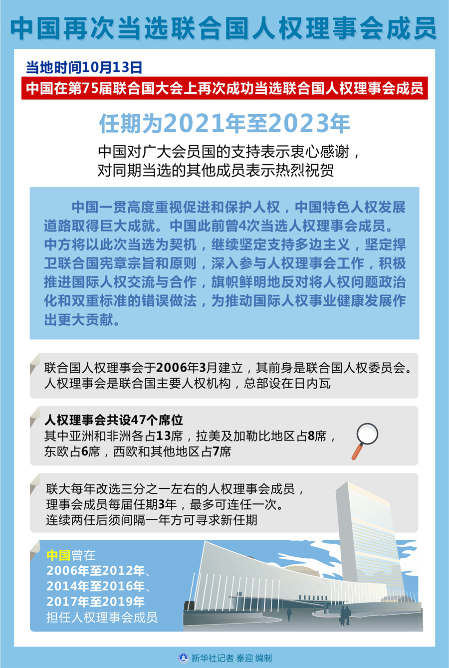 新華社聯(lián)合國(guó)10月13日電 10月13日,中國(guó)在第75屆聯(lián)合國(guó)大會(huì)上再次成功當(dāng)選聯(lián)合國(guó)人權(quán)理事會(huì)成員,任期為2021年至2023年。中國(guó)對(duì)廣大會(huì)員國(guó)的支持表示衷心感謝,對(duì)同期當(dāng)選的其他成員表示熱烈祝賀。