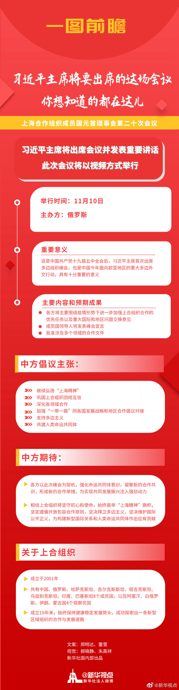 國家主席習(xí)近平將于11月10日在北京出席上海合作組織成員國元首理事會第二十次會議并發(fā)表重要講話。此次會議將以視頻方式舉行。習(xí)近平主席出席此次會議有何重要意義?請看下圖↓ ????