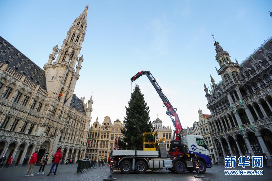 這是11月19日在比利時布魯塞爾大廣場拍攝的圣誕樹安裝現(xiàn)場。