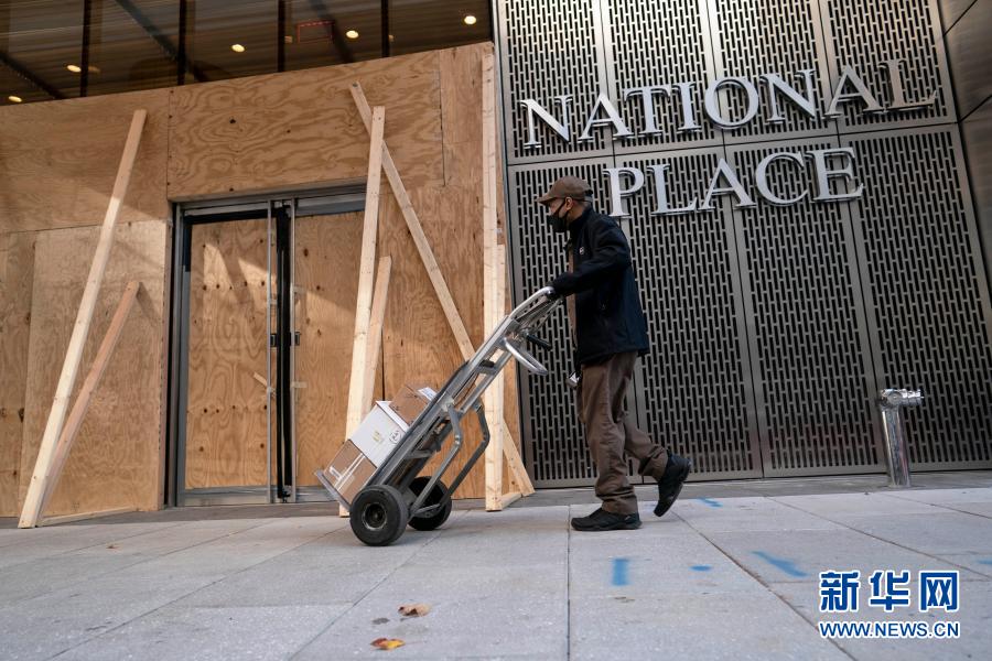 11月19日,美國(guó)華盛頓的一名快遞員經(jīng)過(guò)一處用木板加固門(mén)窗的辦公樓。新華社記者 劉杰 攝