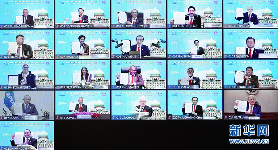11月20日晚,國家主席習(xí)近平在北京以視頻方式出席亞太經(jīng)合組織第二十七次領(lǐng)導(dǎo)人非正式會議并發(fā)表重要講話。這是與會各經(jīng)濟(jì)體領(lǐng)導(dǎo)人、代表通過《2040年亞太經(jīng)合組織布特拉加亞愿景》并線上合影。 新華社記者 李響 攝