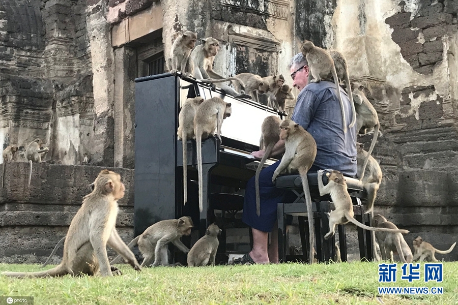 11月21日,泰國華富里府,英國鋼琴家保羅·巴頓(Paul Barton)為一群猴子彈鋼琴。演奏過程中,多只猴子在他周圍跑來跑去,有幾只還爬上了鋼琴,甚至在他的頭頂跳來跳去。巴頓稱,這場(chǎng)特殊的音樂會(huì)旨在引起人們對(duì)這群饑餓的猴子的重視。(圖片來源:東方IC)